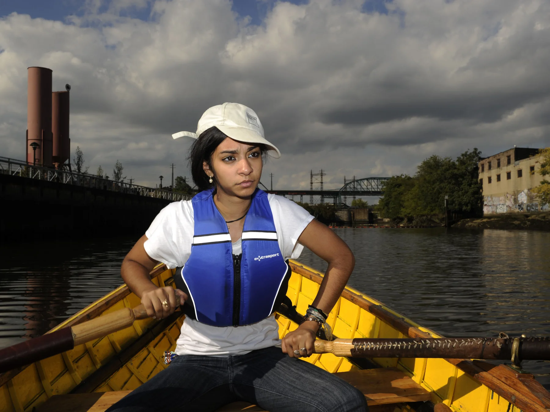 Danise Infante, a high school student, rows a boat she helped build, in the Bronx River. She built the boat at an after school program called "Rocking the Boat," a program that teaches high school students how to build boats and teach the public about the Bronx River. Access to the river had been blocked by dump sites and vacant lots. Environmental community activists are transforming the river into a greenway zone. Danise says her experience has helped turn her into an environmental activist.